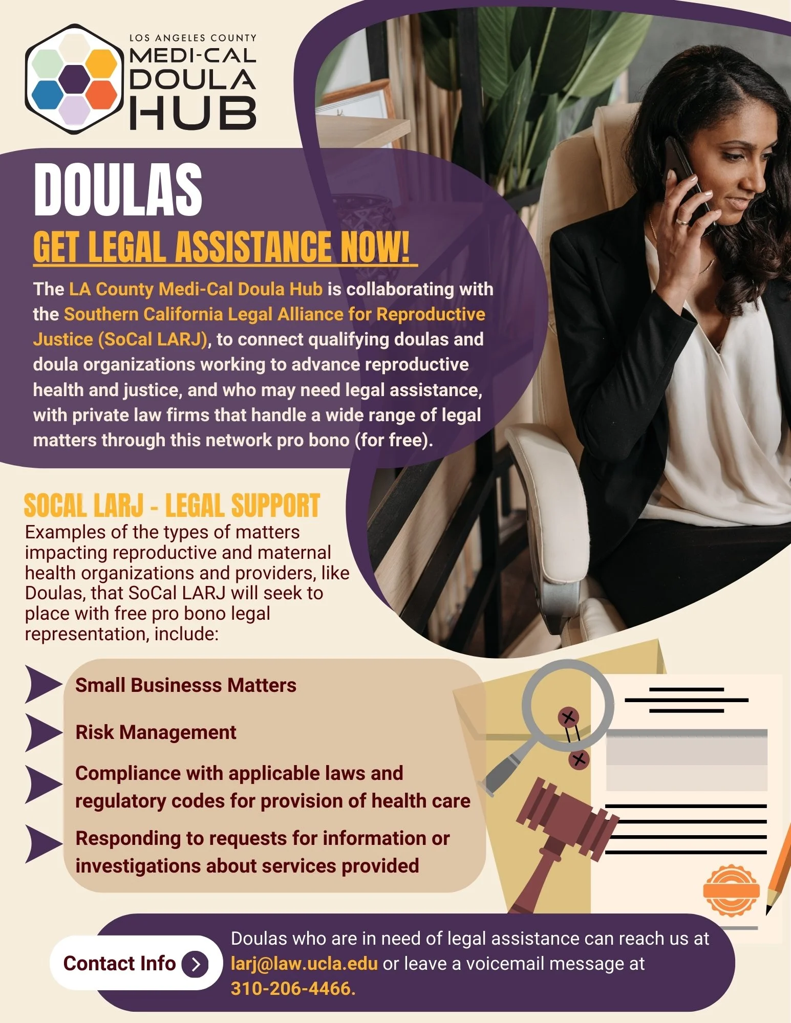 CONTACT: Doulas who are in need of assistance on any of the above matters, or regarding other legal issues, can reach us at larj@law.ucla.edu or leave a voicemail message at 310-206-4466.